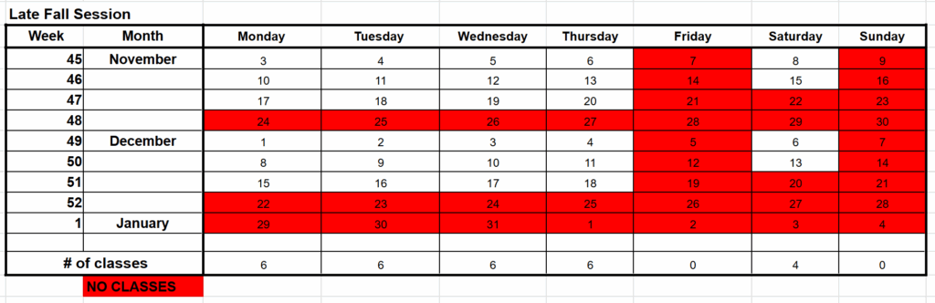 Missed Classes: If you know in advance specific days you will be missing class, we are happy to work with you. Please let us know the days you will not be able to attend when filling out your registration form. We will email you a list of optional make up days and times in available classes.