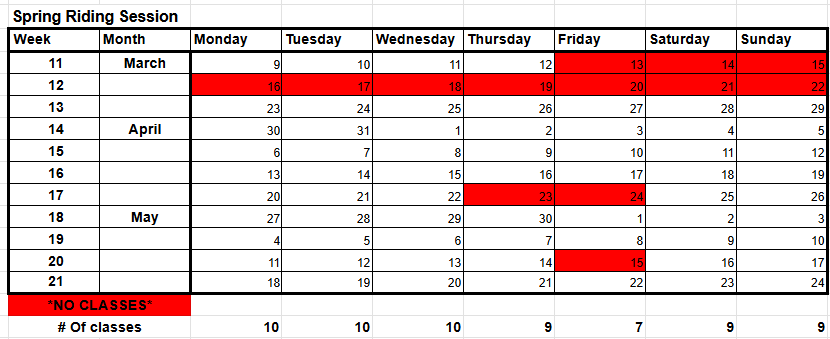 Spring Session Class Schedule