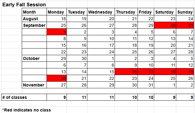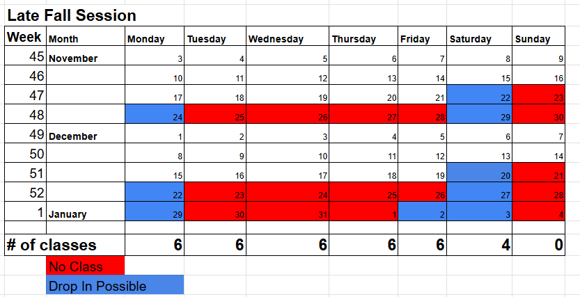 Late registrations are accepted. Your session will be prorated based on the # of classes that remain.